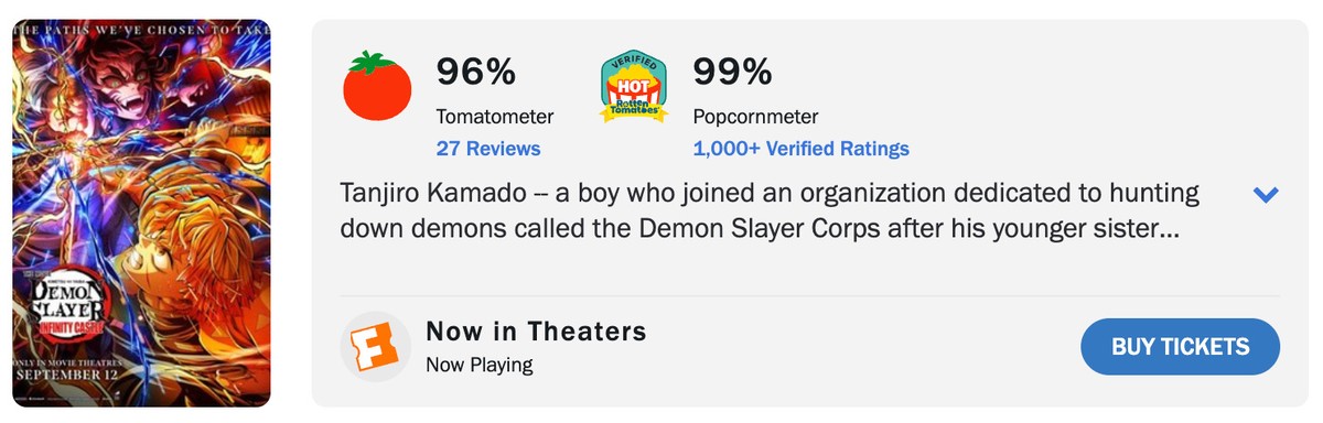 Аниме-фильм "Истребитель демонов: Бесконечный замок" набрал впечатляющие 96% на Rotten Tomatoes после 27 рецензий критиков, а зрительские оценки достигли 99%. Подобные результаты выводят картину в топ лучших аниме-проектов в истории кинематографа.